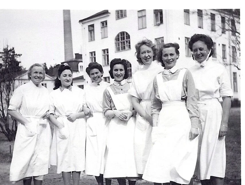 Rachel (second from left) with operating room personnel at Soderby Sjukhus (South Village Hospital), Sweden, 1947. (See Epilogue in All the Horrors of War for an unforgettable operating room scene.)